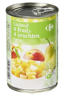 فواكه بنسب متفاوتة (خوخ مكعبات، كمثرى مكعبات، شرائح أناناس، عنب)، ماء، سكر، محمض: حامض الستريك.