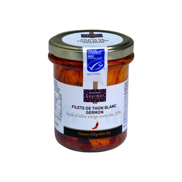 شرائح تونة ألباكور مع زيت الزيتون البكر الممتاز (33%) وفلفل الإسبيليت.