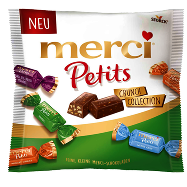 Merci Petits are exquisite little chocolates in Merci's most popular varieties, each individually wrapped. Selected fine ingredients of the highest quality and all of Storck's experience make Merci Petits a very special chocolate delight. Enjoy merci petits in your favorite variety of Chocolate Crunch Collection - a delicious piece of Chocolate Crunch Collection, smooth and melting with a particularly high cocoa content. Perfect for gifting and sharing.