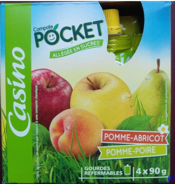 Common name: 2 gourds of apple and apricot compote reduced in sugar (30% less sugar compared to a classic compote) 2 gourds of apple and pear compote reduced in sugar (30% less sugar by compared to a classic compote)