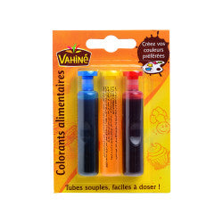 Vahiné vous propose cet assortiment de 3 colorants (jaune, rouge, bleu), pour teinter toutes vos préparations (glaçages, cupcakes, pâte d’amandes, meringues…)..