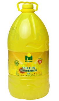 Huile de tournesol, pour cuisson et assaisonnement. 0% cholestérol. Valeur énergétique : 900 Kcal / 100 g. Volume : 5 L.