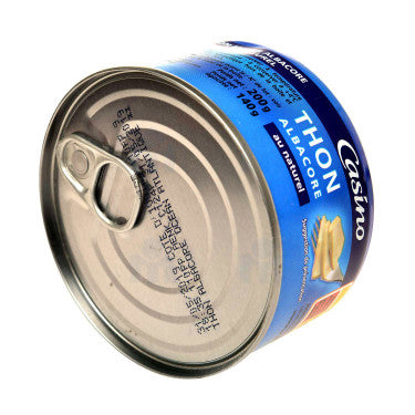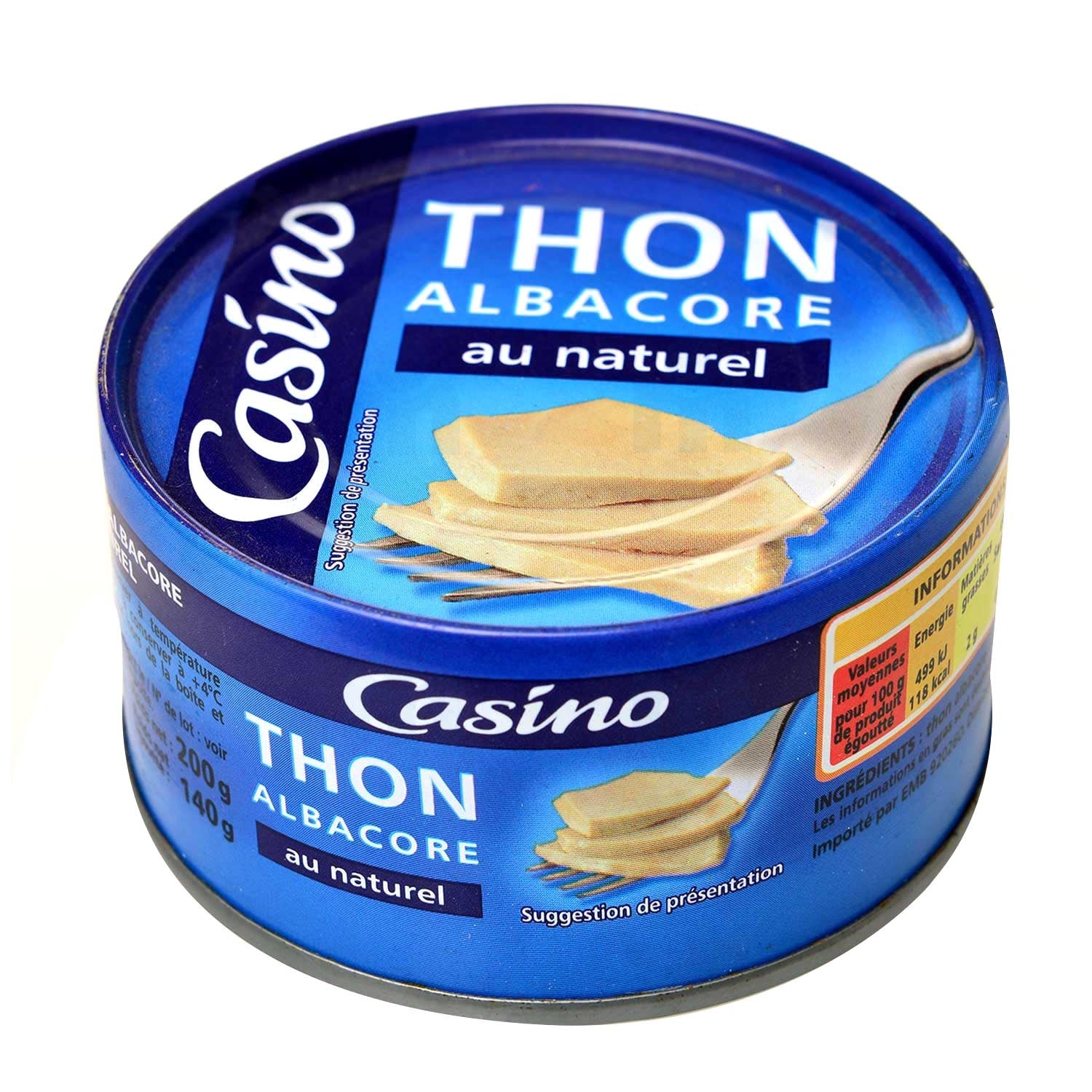 Thon albacore au naturel. Matières grasses: 2 g pour 100 g. Valeur énergétique: 118 Kcal pour 100 g. Poids net: 200 g